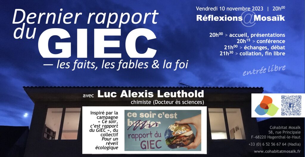 En 3 parties, chacune de 30 minutes environ (avec questions), ont été abordés ces points: – les faits: comment les rapports du GIEC sont-ils produits ? D’où viennent leurs conclusions? – les fables: sont-elles les conclusions et propositions du GIEC ? Ou alors viennent-elles des personnes qui disent que ces conclusions et propositions sont elles-mêmes des fables ? – la foi: quand ce n’est pas mon domaine d’expertise, qui est-ce que je crois ? Qu’est-ce que je crois ? Pourquoi ? Pour quoi ?