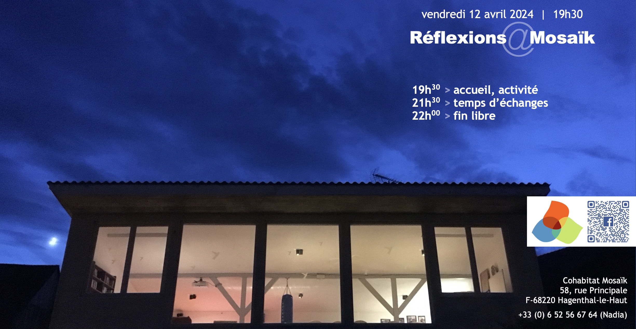 Démarées à l’automne 2019, les soirées « Réflexions @ Mosaïk » ont pour but le temps d’une soirée de favoriser la réflexion (dans le sens de « réfléchir à », questionner) quant à un thème d’actualité ou qui nous est cher; et susciter également de quoi favoriser la réflexion (dans le sens de renvoyer, de la « lumière » ou du « bon ») d’un « meilleur », le passage à l’action, là où nous sommes…