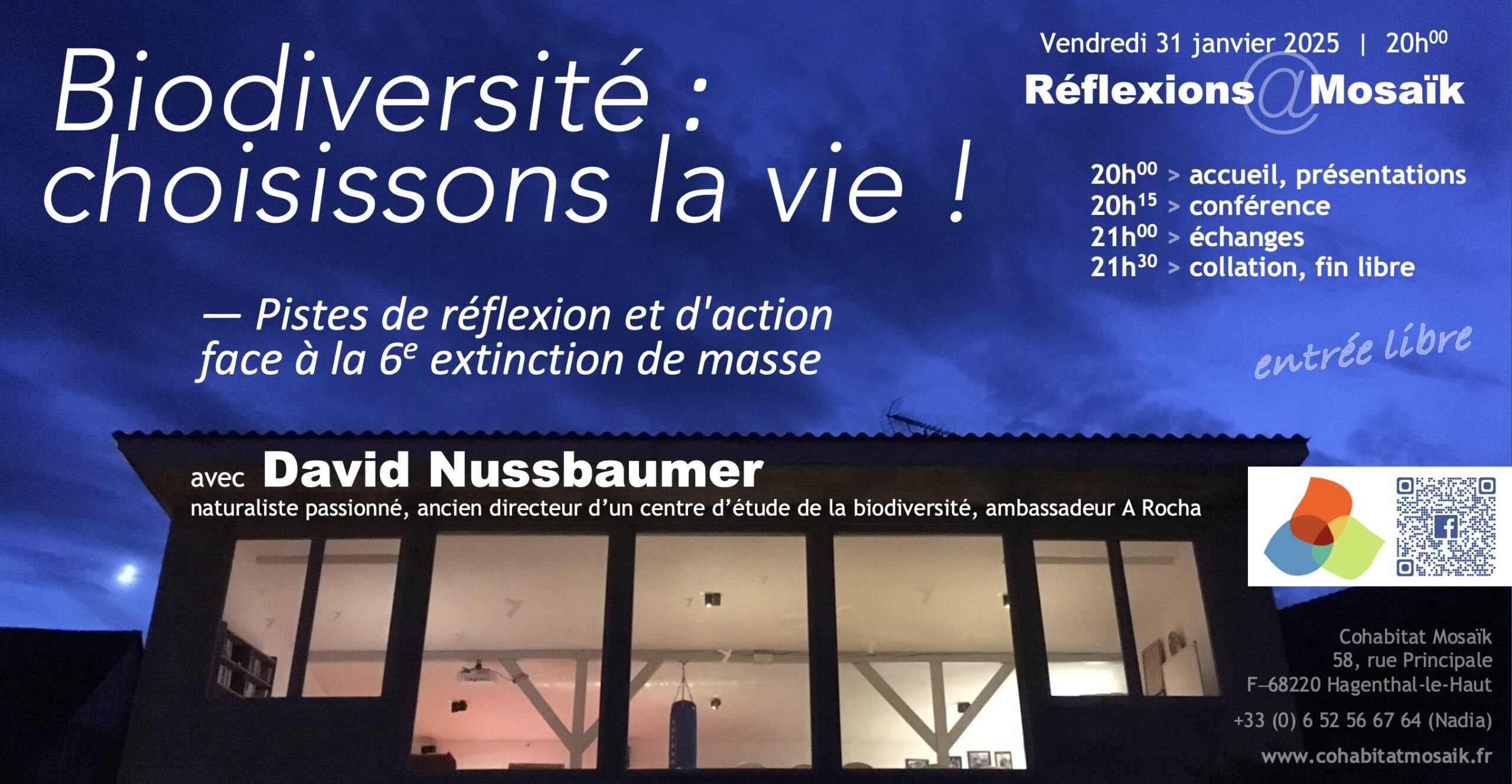 vendredi 31 janvier 2025, 20h00 avec David Nussbaumer naturaliste passionné, ancien directeur d’un centre d’étude de la biodiversité, ambassadeur A Rocha