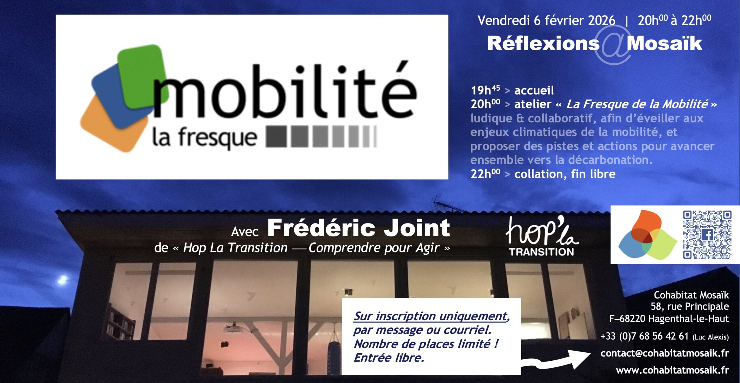 C’est quoi ? Une suite concrète, participative, au dernier film projeté, « La nouvelle aventure mobile » ! Inspirée de la célèbre Fresque du Climat, la Fresque de la Mobilité est un serious game (jeu sérieux) qui repose sur l’intelligence collective. Munis de cartes informatives à placer sur un plateau de jeu, les participants échangent, apprennent, agissent dans un climat bienveillant. La Fresque de la Mobilité permet de mieux comprendre comment adopter individuellement et collectivement une mobilité plus sobre.